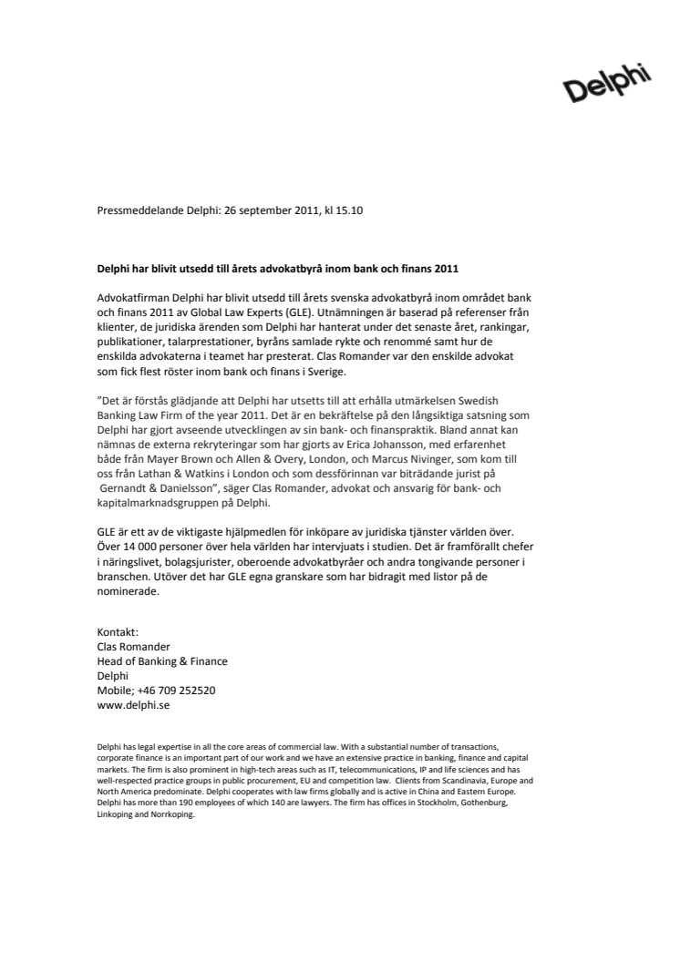 Advokatfirman Delphi har blivit utsedd till årets svenska advokatbyrå inom området bank och finans 2011 av Global Law Experts (GLE). Clas Romander, chef för Delphis bank- och finansgrupp, var den enskilde advokat som fick flest röster inom bank och finans i Sverige.