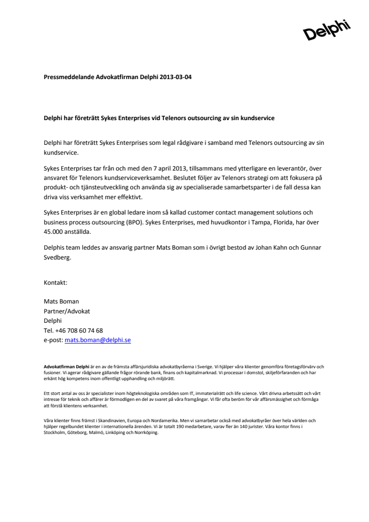 Delphi har företrätt Sykes Enterprises som legal rådgivare i samband med Telenors outsourcing av sin kundservice.