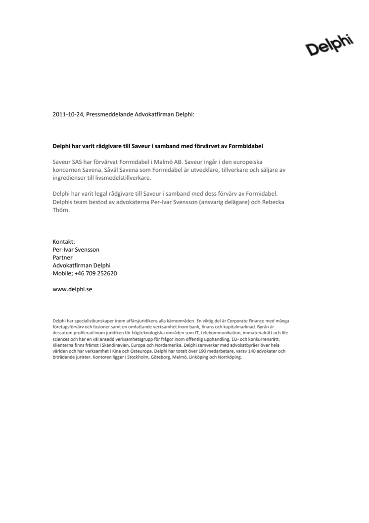 Delphi har varit rådgivare till Saveur i samband med förvärvet av Formbidabel