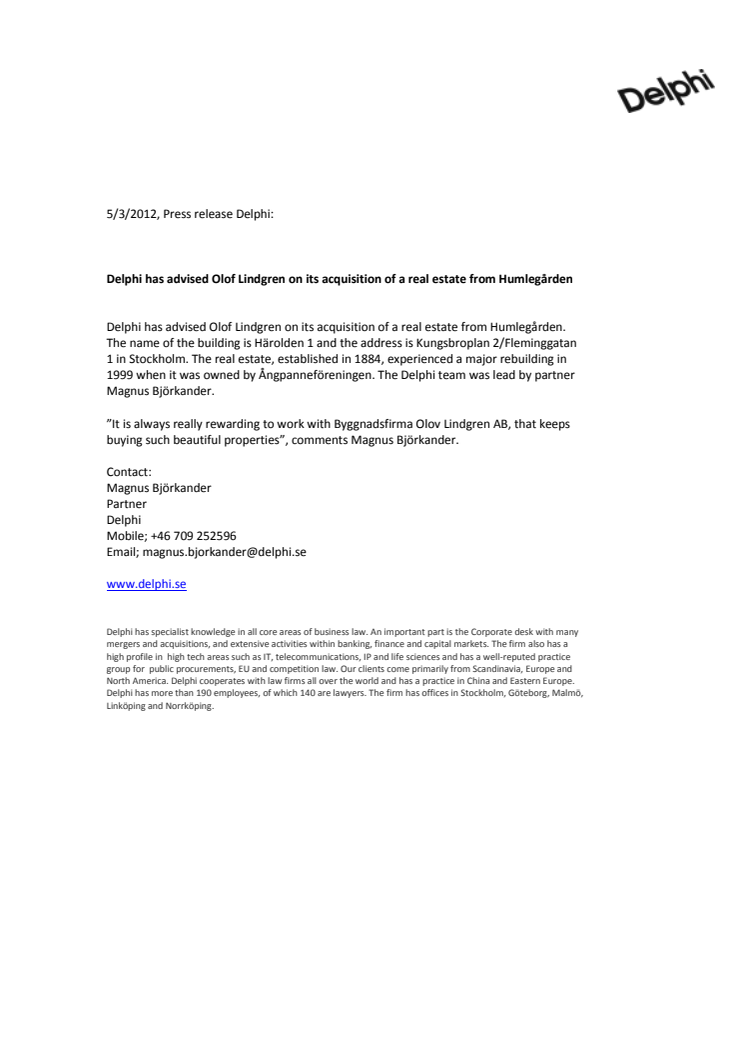 Delphi has advised Olof Lindgren on its acquisition of a real estate from Humlegården