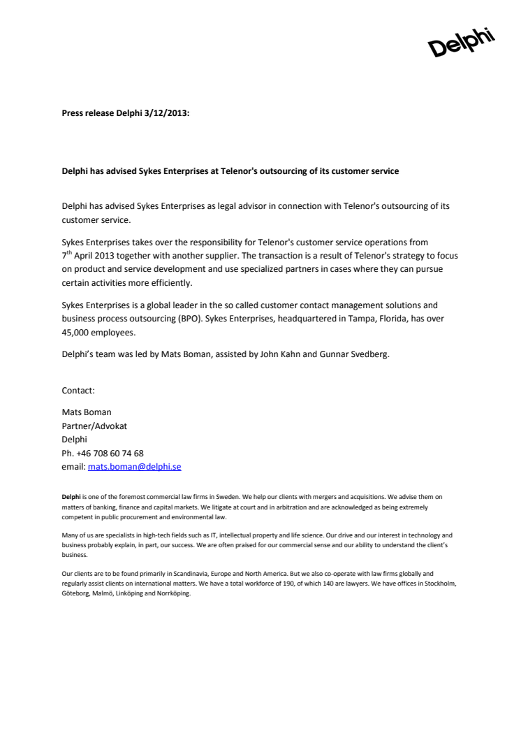 Delphi has advised Sykes Enterprises as legal advisor in connection with Telenor's outsourcing of its customer service.
