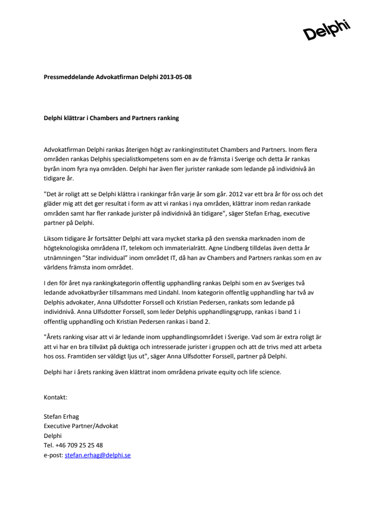 Advokatfirman Delphi rankas återigen högt av rankinginstitutet Chambers and Partners. Inom flera områden rankas Delphis specialistkompetens som en av de främsta i Sverige och detta år rankas byrån inom fyra nya områden. Delphi har även fler jurister rankade som ledande på individnivå än tidigare år.