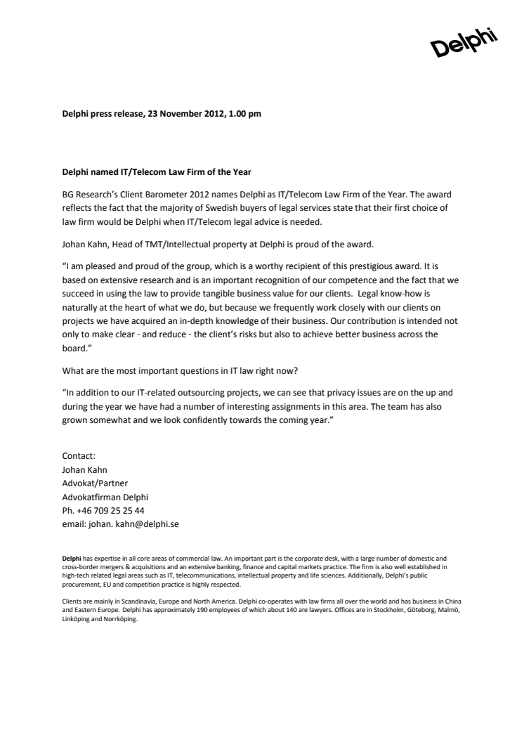 BG Research’s Client Barometer 2012 names Delphi as IT/Telecom Law Firm of the Year. The award reflects the fact that the majority of Swedish buyers of legal services state that their first choice of law firm would be Delphi when IT/Telecom legal advice is needed.
