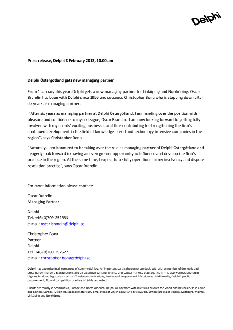 From 1 January this year, Delphi gets a new managing partner for Linköping and Norrköping. Oscar Brandin has been with Delphi since 1999 and succeeds Christopher Bona who is stepping down after six years as managing partner.