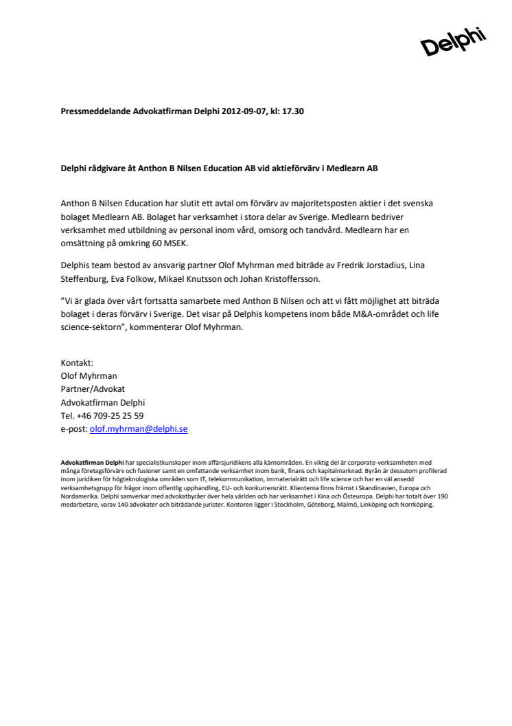 Delphi rådgivare åt Anthon B Nilsen Education AB vid aktieförvärv i Medlearn AB