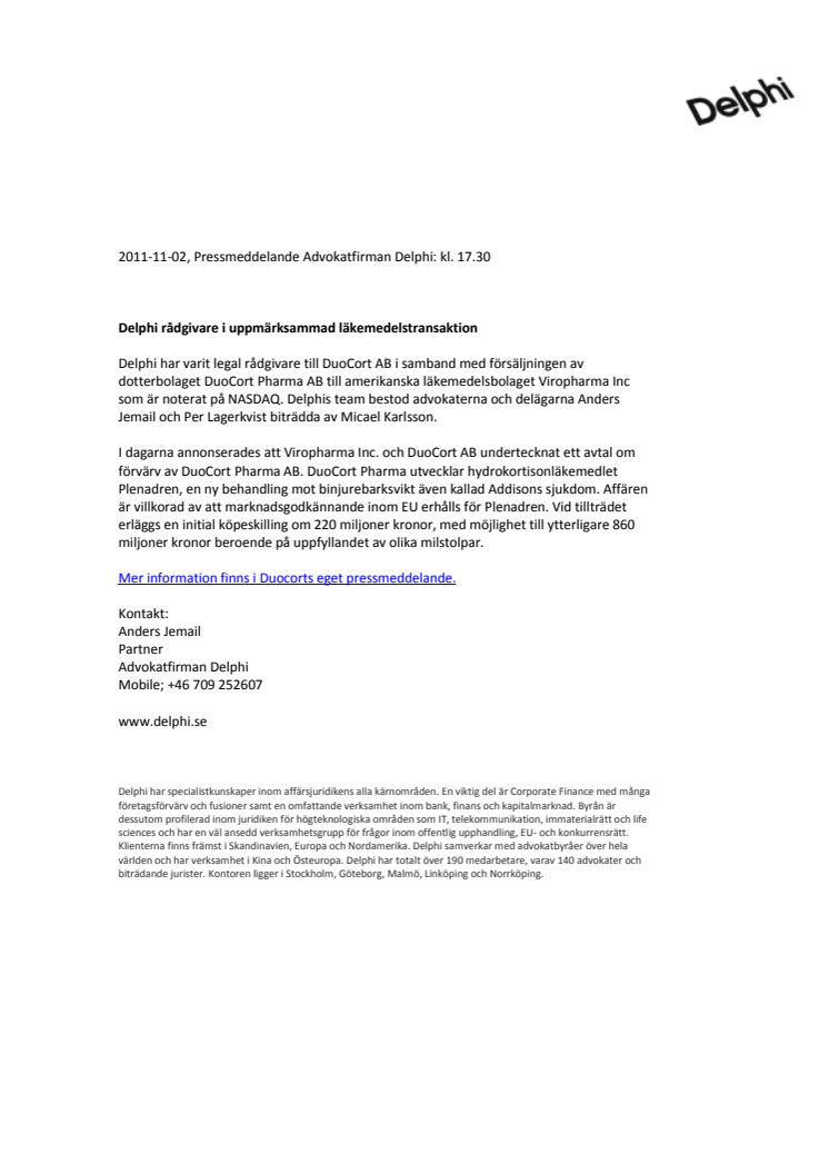Delphi har varit legal rådgivare till DuoCort AB i samband med försäljningen av dotterbolaget DuoCort Pharma AB till amerikanska läkemedelsbolaget Viropharma Inc som är noterat på NASDAQ. Delphis team bestod advokaterna och delägarna Anders Jemail och Per Lagerkvist biträdda av Micael Karlsson.