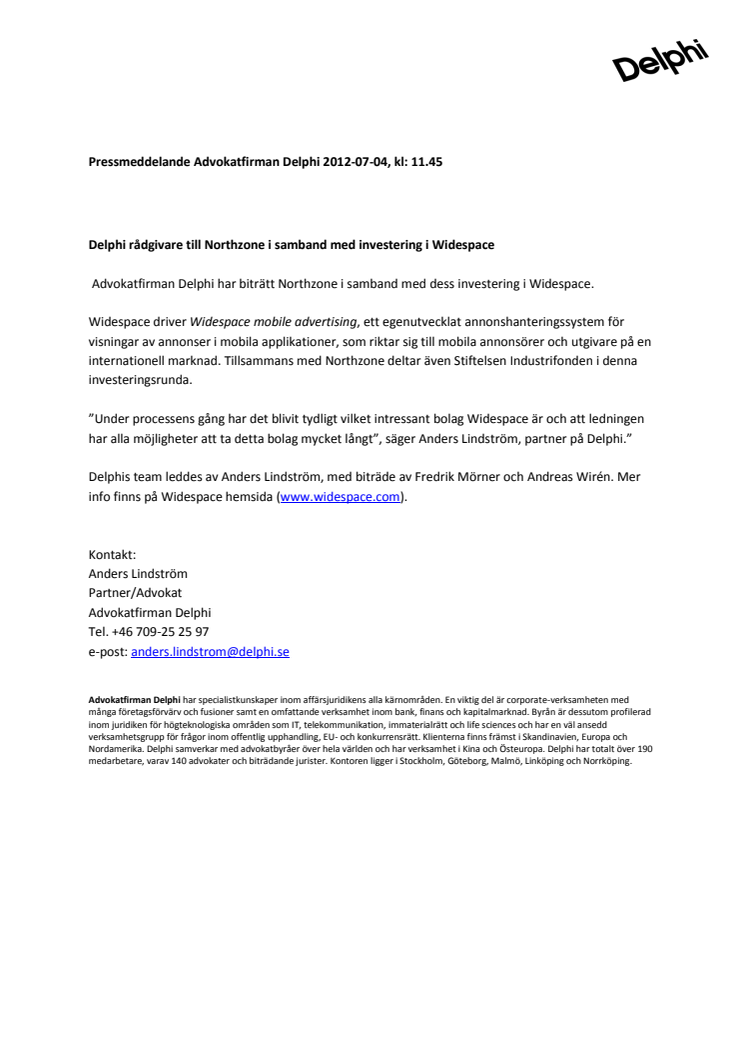 Advokatfirman Delphi har biträtt Northzone i samband med dess investering i Widespace. Widespace driver Widespace mobile advertising, ett egenutvecklat annonshanteringssystem för visningar av annonser i mobila applikationer, som riktar sig till mobila annonsörer och utgivare på en internationell marknad.