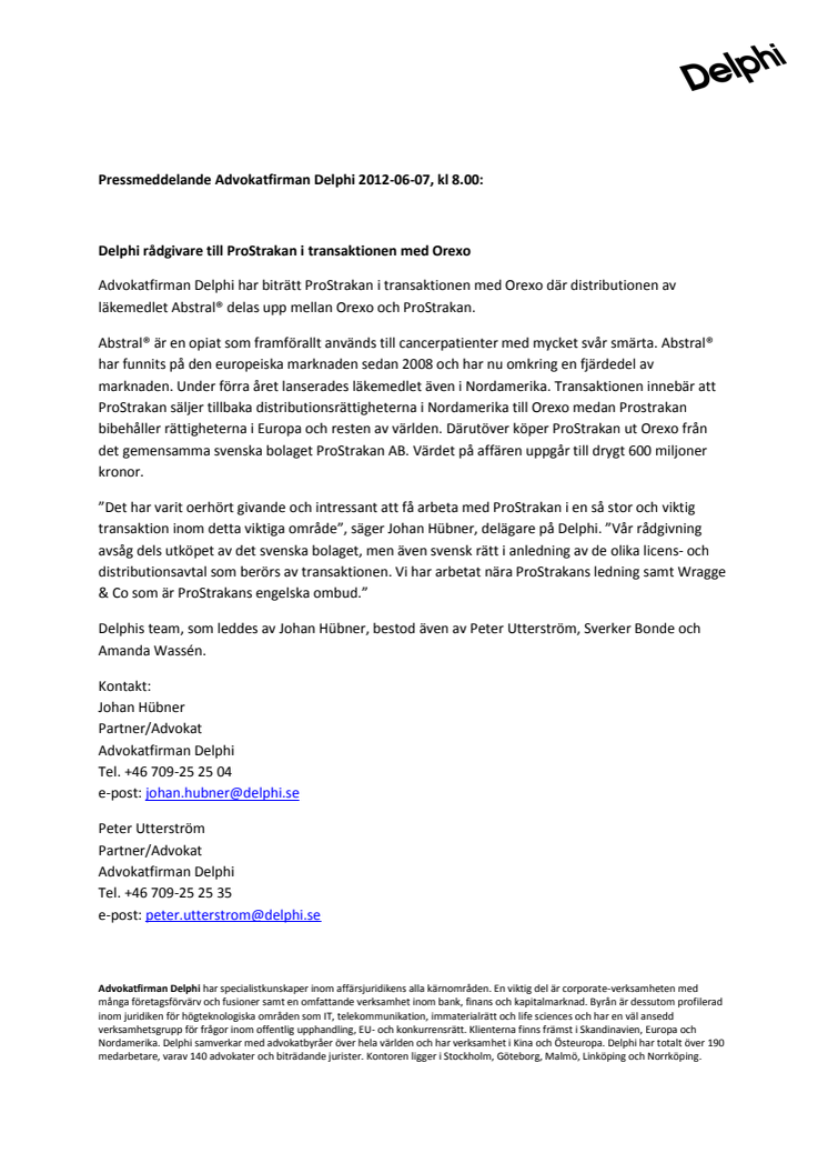 Advokatfirman Delphi har biträtt ProStrakan i transaktionen med Orexo där distributionen av läkemedlet Abstral® delas upp mellan Orexo och ProStrakan. Värdet på affären uppgår till drygt 600 miljoner kronor.