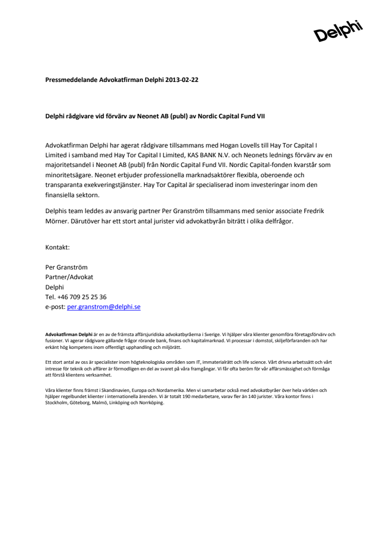Advokatfirman Delphi har agerat rådgivare tillsammans med Hogan Lovells till Hay Tor Capital I Limited i samband med Hay Tor Capital I Limited, KAS BANK N.V. och Neonets lednings förvärv av en majoritetsandel i Neonet AB (publ) från Nordic Capital Fund VII. Nordic Capital-fonden kvarstår som minoritetsägare.