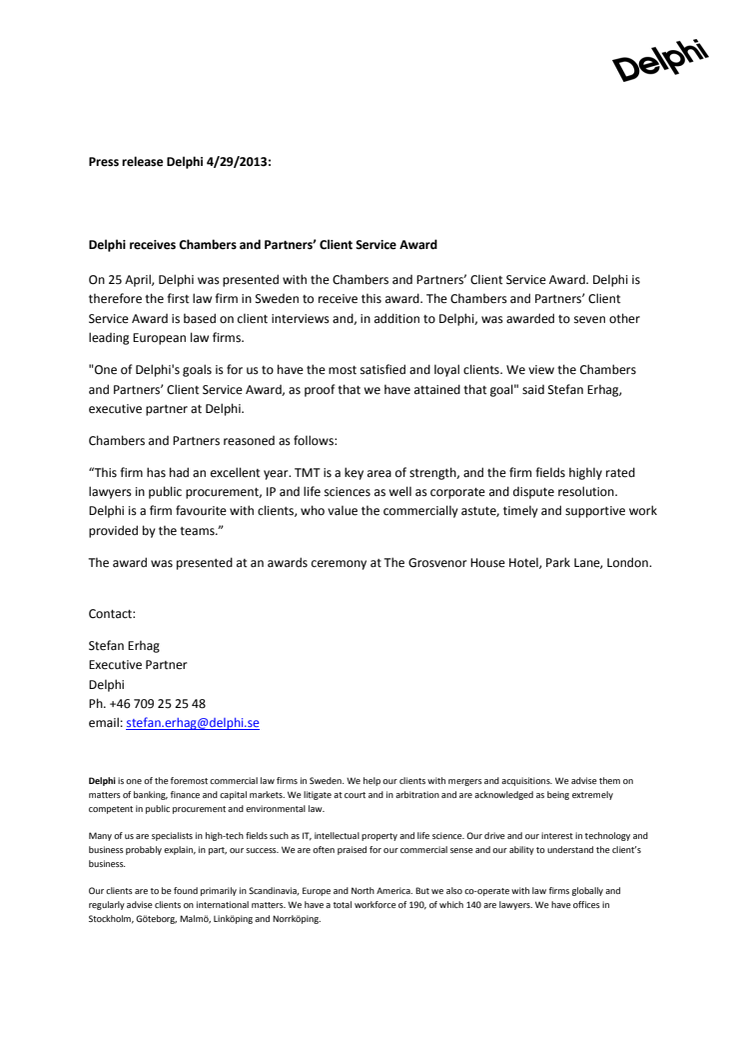 On 25 April, Delphi was presented with the Chambers and Partners’ Client Service Award. Delphi is therefore the first law firm in Sweden to receive this award. The Chambers and Partners’ Client Service Award is based on client interviews and, in addition to Delphi, was awarded to seven other leading European law firms.