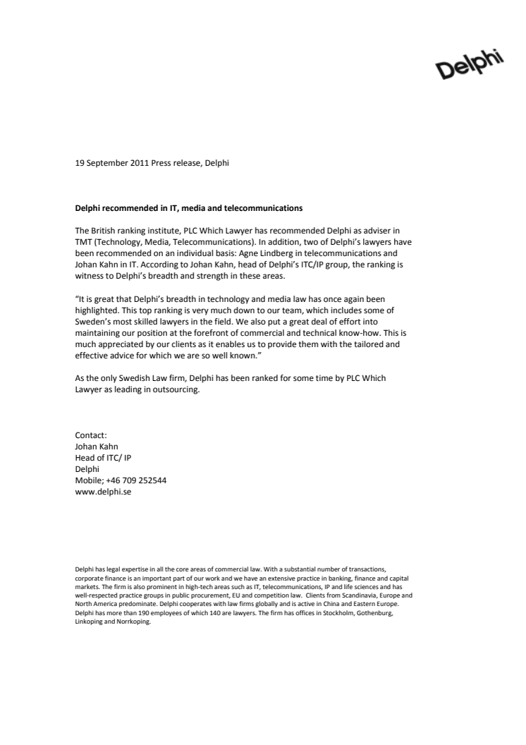 The British ranking institute, PLC Which Lawyer has recommended Delphi as adviser in TMT (Technology, Media, Telecommunications). In addition, two of Delphi’s lawyers have been recommended on an individual basis: Agne Lindberg in telecommunications and Johan Kahn in IT. According to Johan Kahn, head of Delphi’s ITC/IP group, the ranking is witness to Delphi’s strength in these areas.