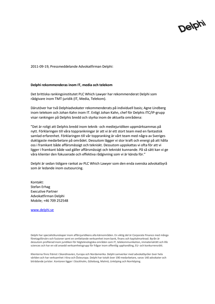 Därutöver har två Delphiadvokater rekommenderats på individuell basis; Agne Lindberg inom telekom och Johan Kahn inom IT. Enligt Johan Kahn, chef för Delphis ITC/IP-grupp visar rankingen på Delphis bredd och styrka inom de aktuella områdena.