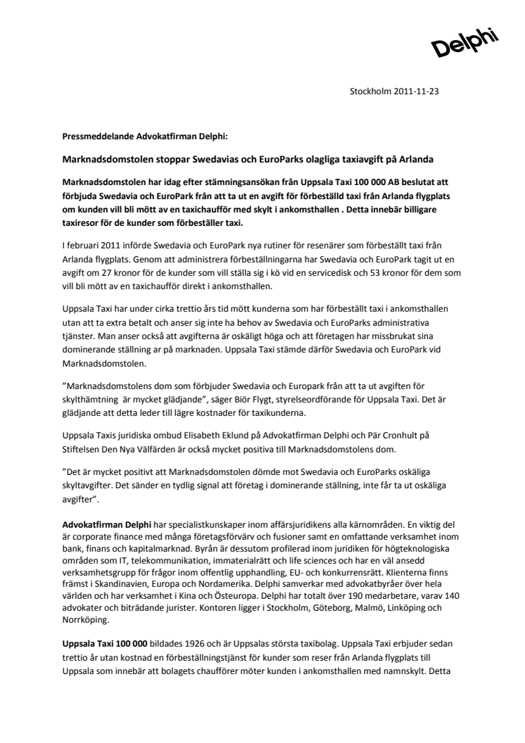 Marknadsdomstolen har idag efter stämningsansökan från Uppsala Taxi 100 000 AB beslutat att förbjuda Swedavia och EuroPark från att ta ut en avgift för förbeställd taxi från Arlanda flygplats om kunden vill bli mött av en taxichaufför med skylt i ankomsthallen. Detta innebär billigare taxiresor för de kunder som förbeställer taxi.