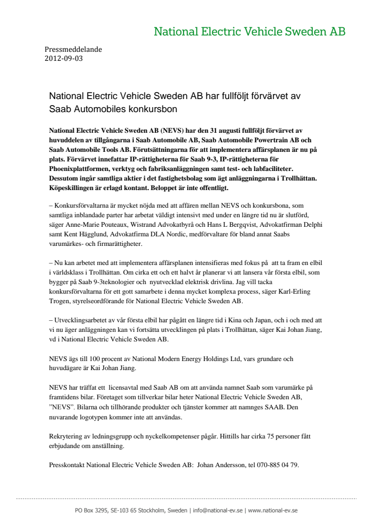 National Electric Vehicle Sweden AB (NEVS) har den 31 augusti fullföljt förvärvet av huvuddelen av tillgångarna i Saab Automobile AB, Saab Automobile Powertrain AB och Saab Automobile Tools AB. Förutsättningarna för att implementera affärsplanen är nu på plats.