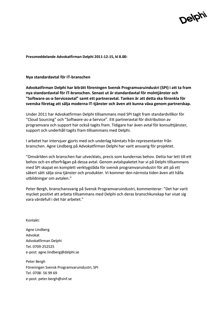 Advokatfirman Delphi har biträtt föreningen Svensk Programvaruindustri (SPI) i att ta fram nya standardavtal för IT-branschen. Senast ut är standardavtal för molntjänster och ”Software-as-a-Serviceavtal” samt ett partneravtal. Tanken är att detta ska förenkla för svenska företag att sälja moderna IT-tjänster och även att kunna växa genom partnerskap.
