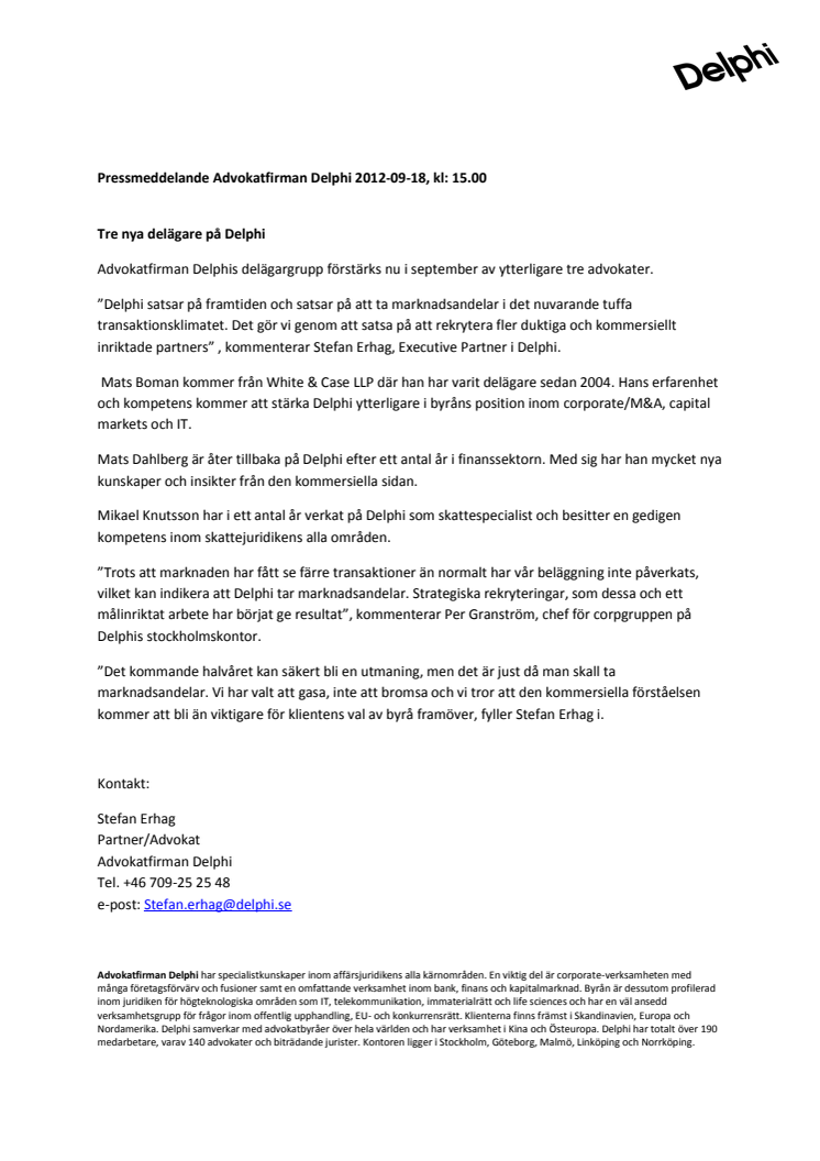 ”Delphi satsar på framtiden och satsar på att ta marknadsandelar i det nuvarande tuffa transaktionsklimatet. Det gör vi genom att satsa på att rekrytera fler duktiga och kommersiellt inriktade partners”, kommenterar Stefan Erhag, Executive Partner på Delphi.