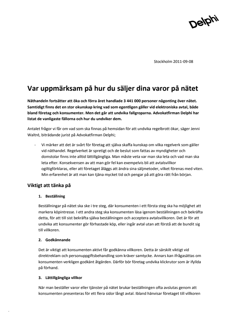 Näthandeln fortsätter att öka och förra året handlade 3 441 000 personer någonting över nätet. Samtidigt finns det en stor okunskap kring vad som egentligen gäller vid elektroniska avtal, både bland företag och konsumenter. Men det går att undvika fallgroparna. Advokatfirman Delphi har listat de vanligaste fällorna och hur du undviker dem.