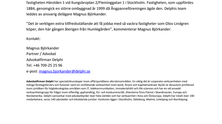 • Delphi har varit rådgivare till Olov Lindgren i samband med förvärvet av en av Humlegårdens fastigheter