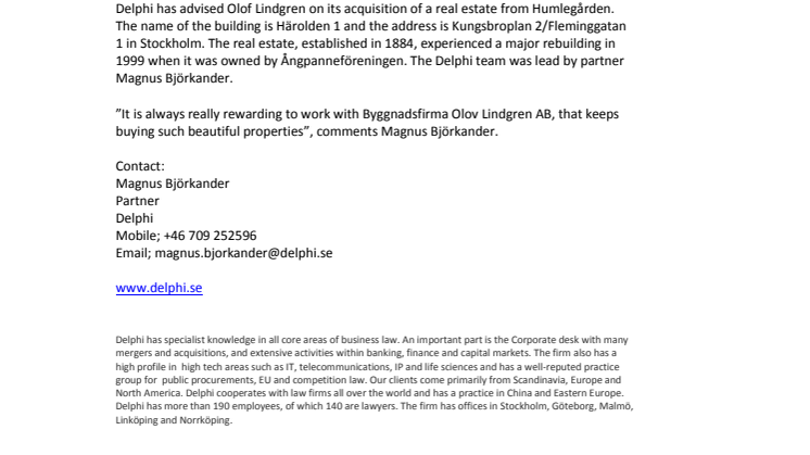 • Delphi has advised Olof Lindgren on its acquisition of a real estate from Humlegården