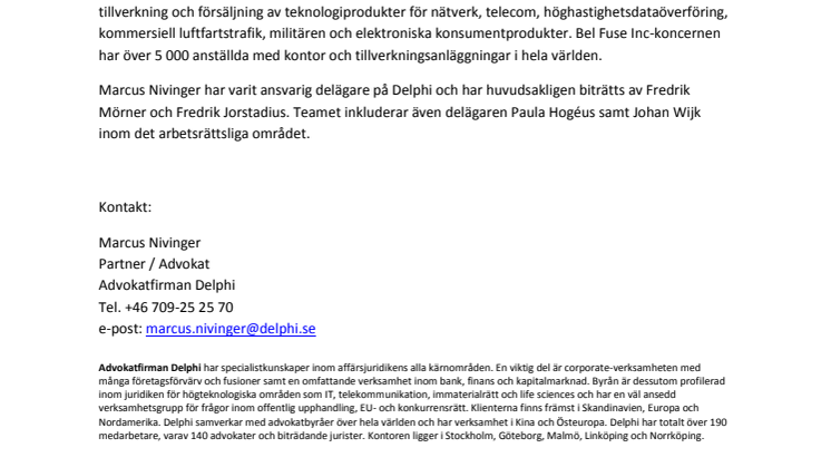 • Delphi biträder NASDAQ-noterade Bel Fuse Inc vid dess förvärv av Gigacom Interconnect AB