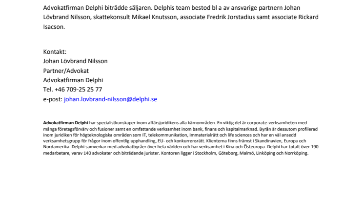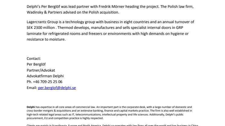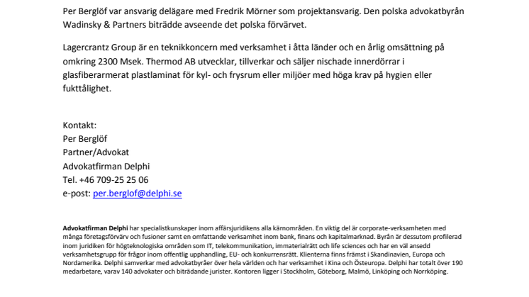 • Delphi rådgivare till Lagercrantz Group i samband med förvärvet av Thermod AB