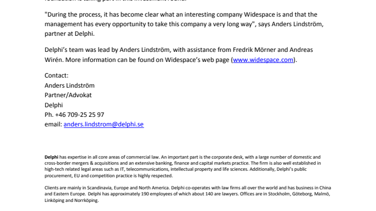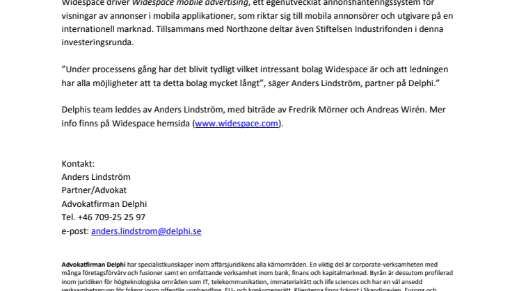 • Delphi rådgivare till Northzone i samband med investering i Widespace