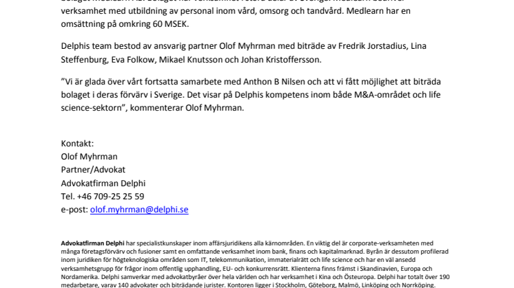 • Delphi rådgivare åt Anthon B Nilsen Education AB vid aktieförvärv i Medlearn AB