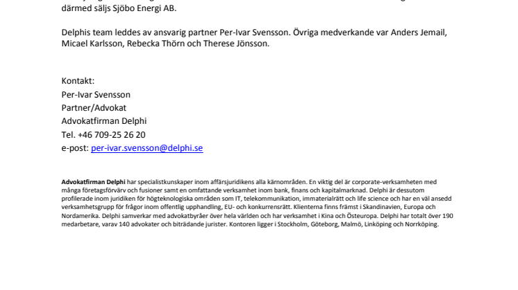 • Delphi rådgivare till Sjöbo kommun när Bixia blir ny ägare till Sjöbo Energi AB