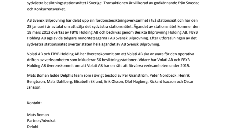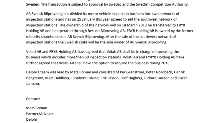 • Delphi företräder Volati AB i samband med AB Svensk Bilprovnings försäljning av det sydvästra besiktningsstationsnätet