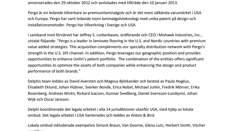 • Delphi har biträtt Unilin och Mohawk Industries vid förvärvet av Pergo