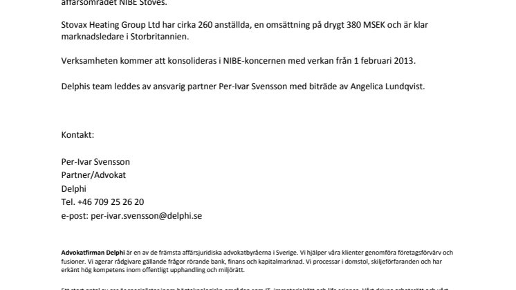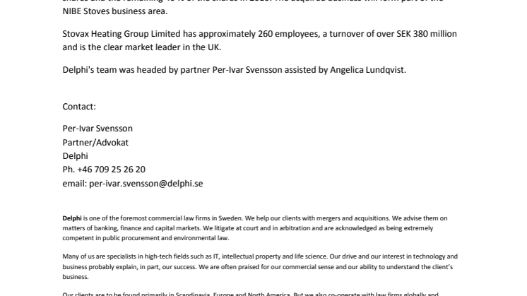 • Delphi har företrätt Nibe Industrier AB (publ) i förvärvet av Stovax Heating Group Limited