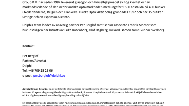 • Delphi rådgivare vid förvärvet av Direkt Optik Aktiebolag