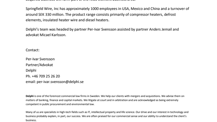 • Delphi har biträtt Nibe Industrier AB (publ) vid förvärvet av Springfield Wire