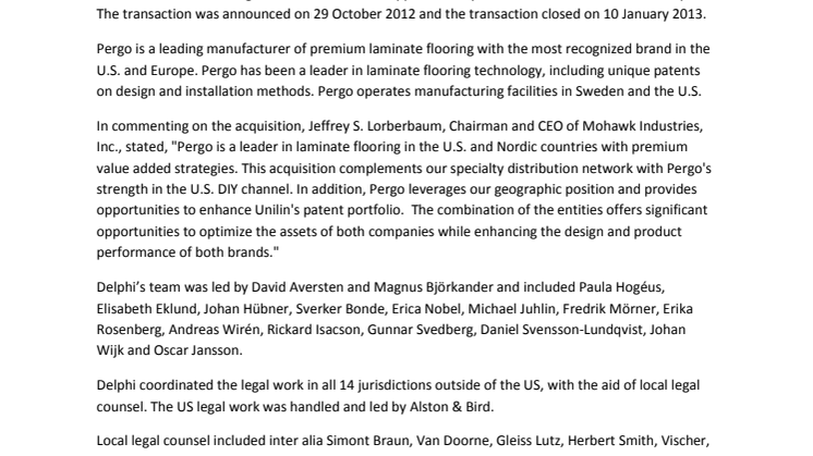 • Delphi advised Unilin and Mohawk Industries in the acquisition of Pergo