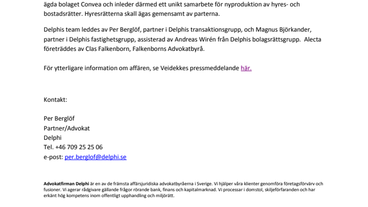• Delphi assisterar Veidekke Bostad i ett unikt joint venture samarbete mellan Alecta och Veidekke Bostad för nya bostäder