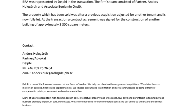 • Delphi advises Volati AB in connection with AB Svensk Bilprovning’s sale of the southwest network of inspection stations
