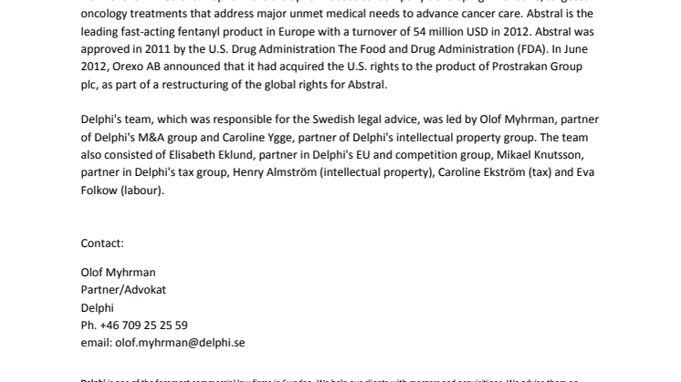 • Delphi rådgivare åt Galena Biopharma, Inc. vid förvärvet av läkemedlet Abstral i USA från Orexo AB