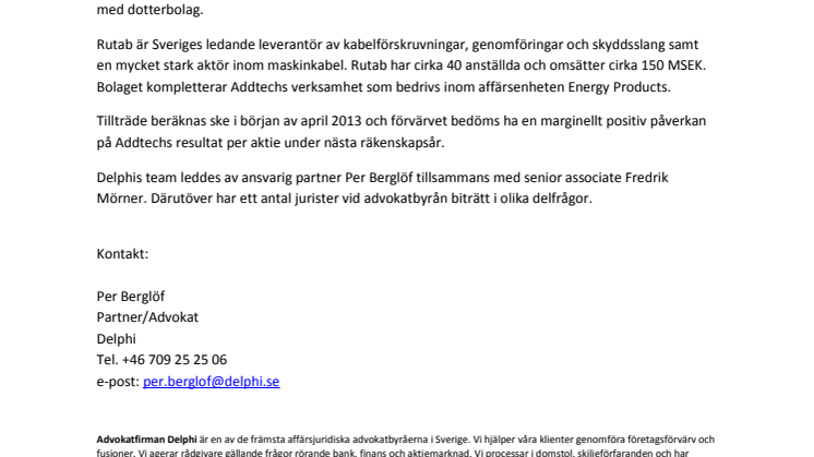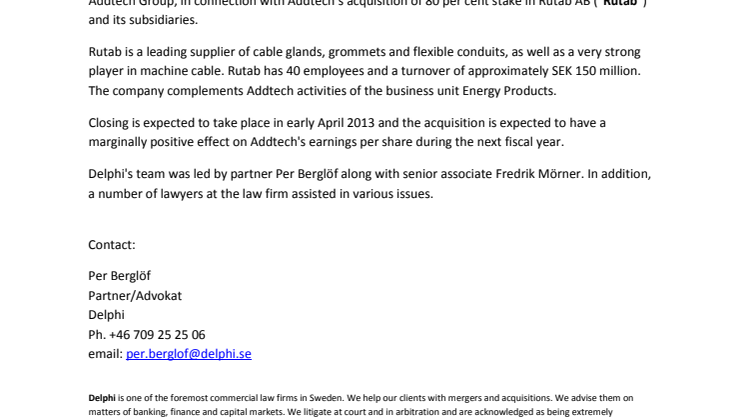 • Delphi rådgivare när Addtech förvärvade 80 procent av aktierna i Rutab AB
