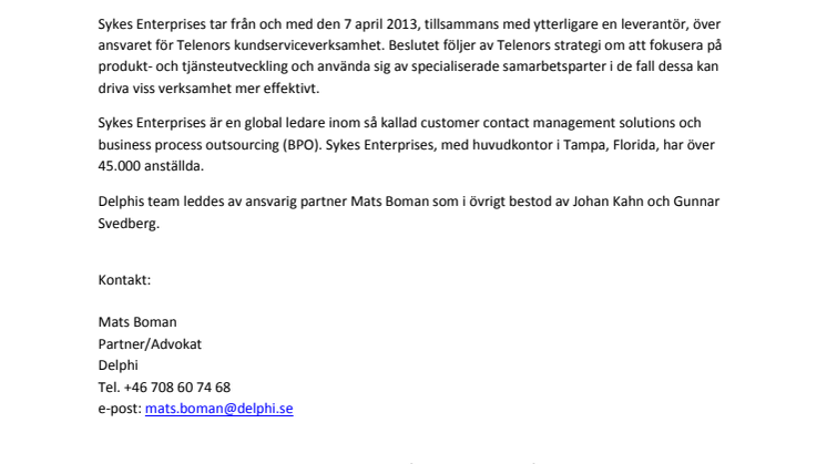 • Delphi har företrätt Sykes Enterprises vid Telenors outsourcing av sin kundservice