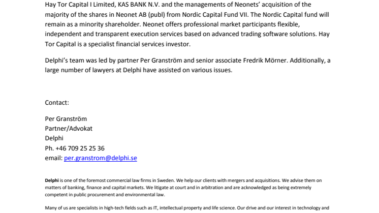 • Delphi advised on the acquisition of Neonet AB (publ) from Nordic Capital Fund VII