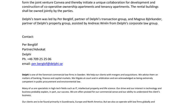 • Delphi advises Veidekke Bostad in a unique joint venture between Alecta and Veidekke Bostad for new housing
