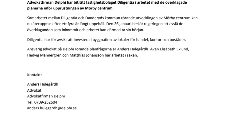 Advokatfirman Delphi har biträtt fastighetsbolaget Diligentia i arbetet med de överklagade planerna inför upprustningen av Mörby centrum.