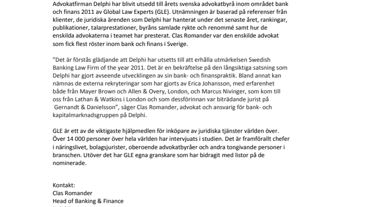Advokatfirman Delphi har blivit utsedd till årets svenska advokatbyrå inom området bank och finans 2011 av Global Law Experts (GLE). Utnämningen är baserad på referenser från klienter, de juridiska ärenden som Delphi har hanterat under det senaste året, rankingar, publikationer, talarprestationer, byråns samlade rykte och renommé samt hur de enskilda advokaterna i teamet har presterat. Clas Romander var den enskilde advokat som fick flest röster inom bank och finans i Sverige.