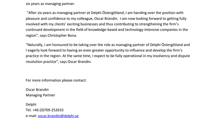 “After six years as managing partner at Delphi Östergötland, I am handing over the position with pleasure and confidence to my colleague, Oscar Brandin. I am now looking forward to getting fully involved with my clients’ exciting businesses and thus contributing to strengthening the firm’s continued development in the field of knowledge-based and technology-intensive companies in the region”, says Christopher Bona.