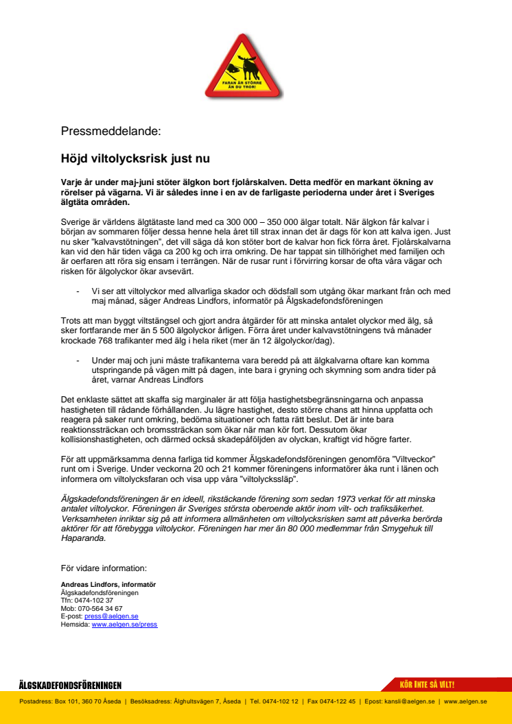 Varje år under maj-juni stöter älgkon bort fjolårskalven. Detta medför en markant ökning av rörelser på vägarna. Vi är således inne i en av de farligaste perioderna under året i Sveriges älgtäta områden.