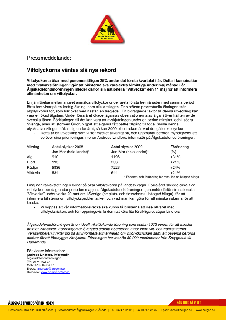 Viltolyckorna ökar med genomsnittligen 25% under det första kvartalet i år. Detta i kombination med ”kalvavstötningen” gör att bilisterna ska vara extra försiktiga under maj månad i år. Älgskadefondsföreningen inleder därför sin nationella ”Viltvecka” den 11 maj för att informera allmänheten om viltolyckor.