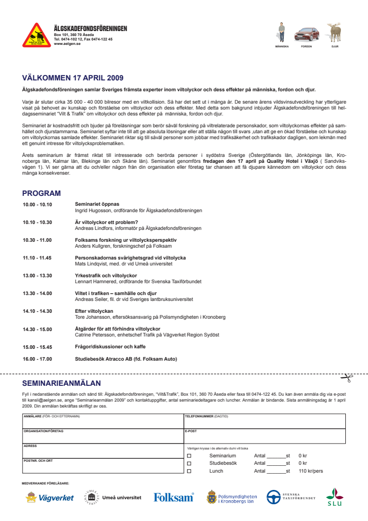 Älgskadefondsföreningen samlar, i ett heldagsseminarium, Sveriges främsta experter inom viltolyckor och dess effekter på människa, fordon och djur.