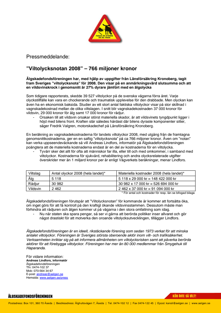 Älgskadefondsföreningen har, med hjälp av uppgifter från Länsförsäkring Kronoberg, tagit fram Sveriges ”viltolycksnota” för 2008. Den visar på en anmärkningsvärd slutsumma och att en vildsvinskrock i genomsnitt är 27% dyrare jämfört med en älgolycka