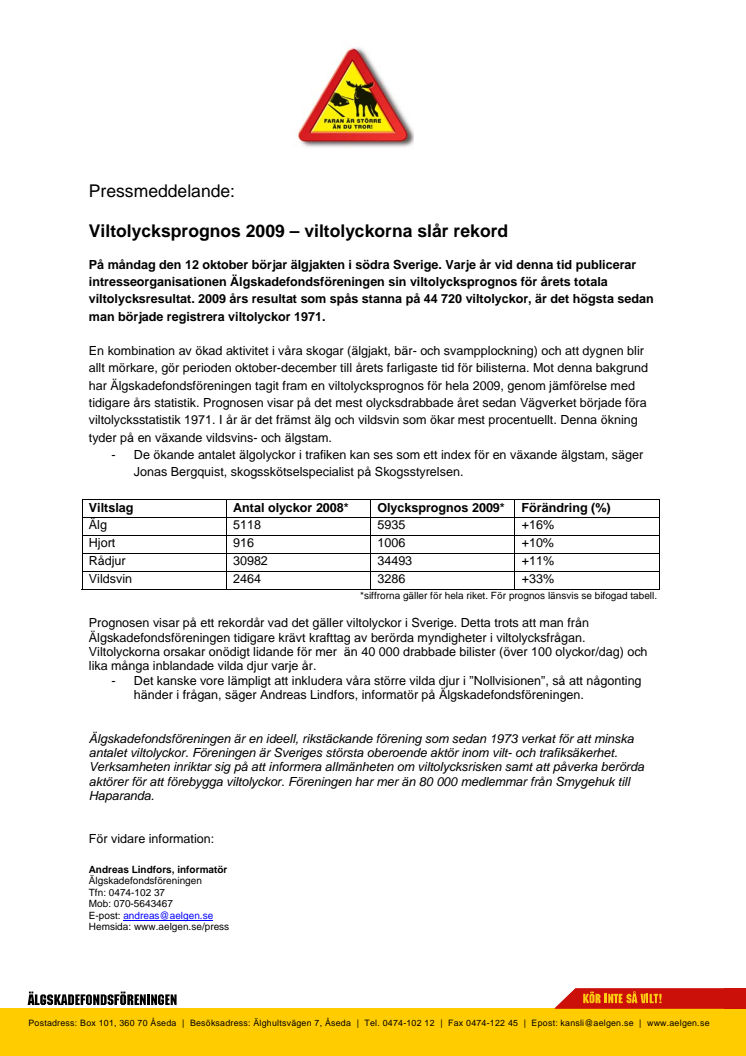 På måndag den 12 oktober börjar älgjakten i södra Sverige. Varje år vid denna tid publicerar intresseorganisationen Älgskadefondsföreningen sin viltolycksprognos för årets totala viltolycksresultat. 2009 års resultat som spås stanna på 44 720 viltolyckor, är det högsta sedan man började registrera viltolyckor 1971.