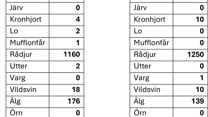 Statistiken visar hur viltolyckorna i Dalarna fördelar sig på det anmälningspliktiga viltet.